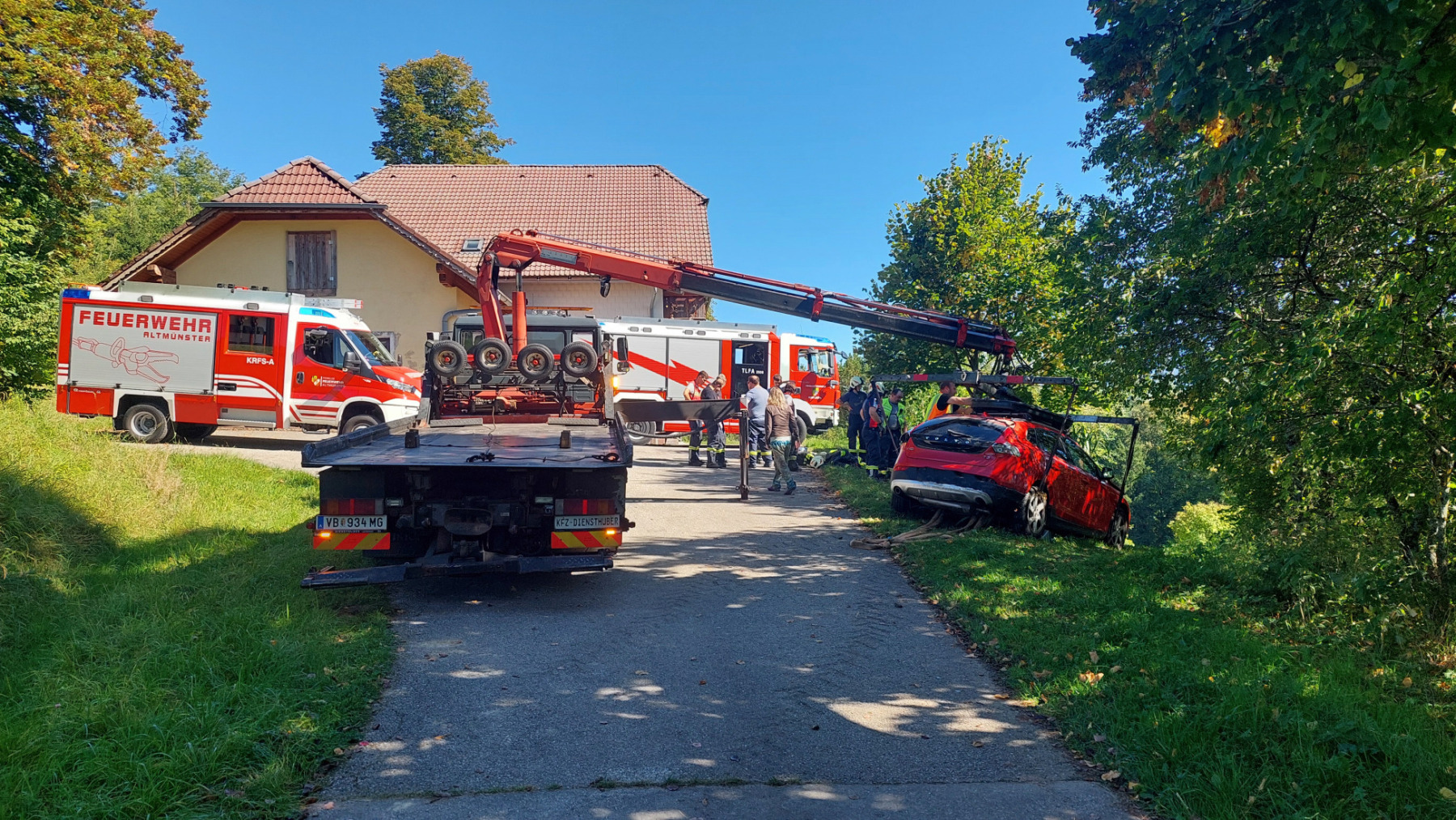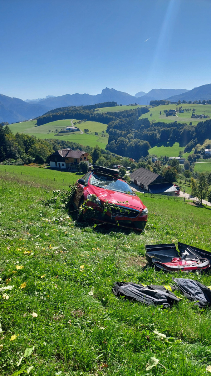 Glücklicherweise befand sich keine Person im Fahrzeug, wodurch Schlimmeres verhindert werden konnte. Der Wagen kam nach einem Überschlag in dichtem Gestrüpp anschließend auf den Rädern zu stehen. Die Feuerwehr Reindlmühl und die Kameraden der FF Altmünster arbeiten professionell zusammen, um das Auto zu bergen.