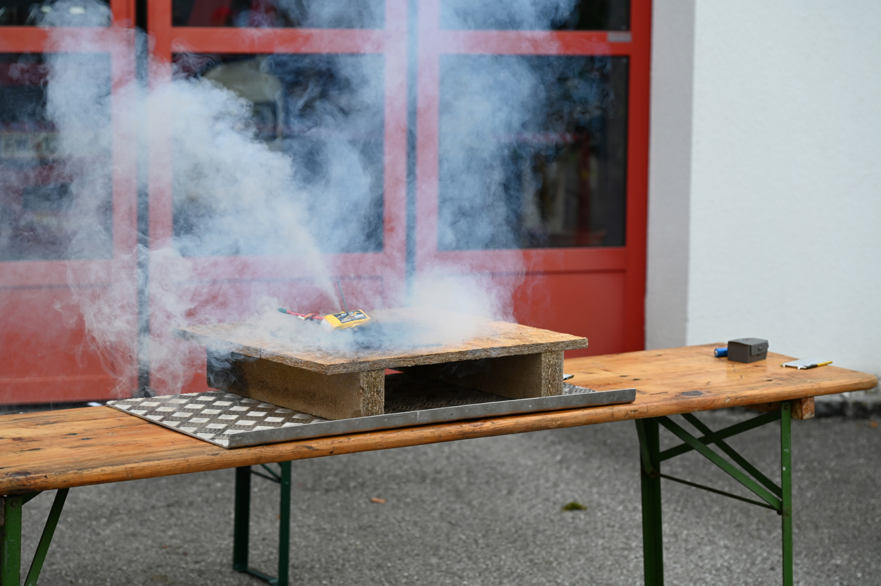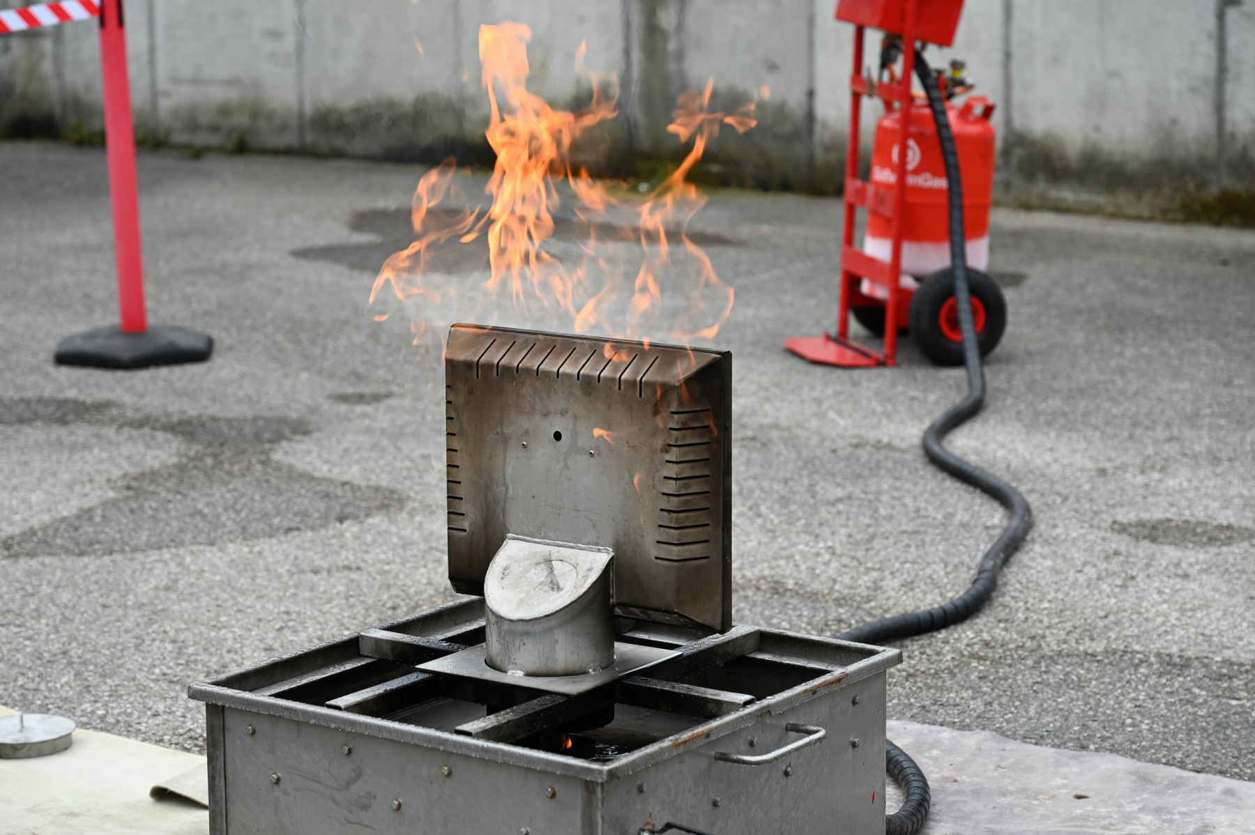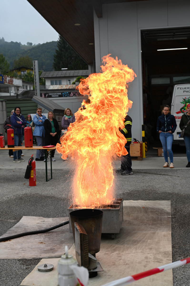 Das Programm begann mit praktischen Vorführungen. Besonders eindrucksvoll war der Fettbrandsimulator, der zeigte, wie gefährlich es ist, brennendes Fett mit Wasser zu löschen. Flammen schossen explosionsartig in die Höhe und machten die Gefahr deutlich sichtbar.
