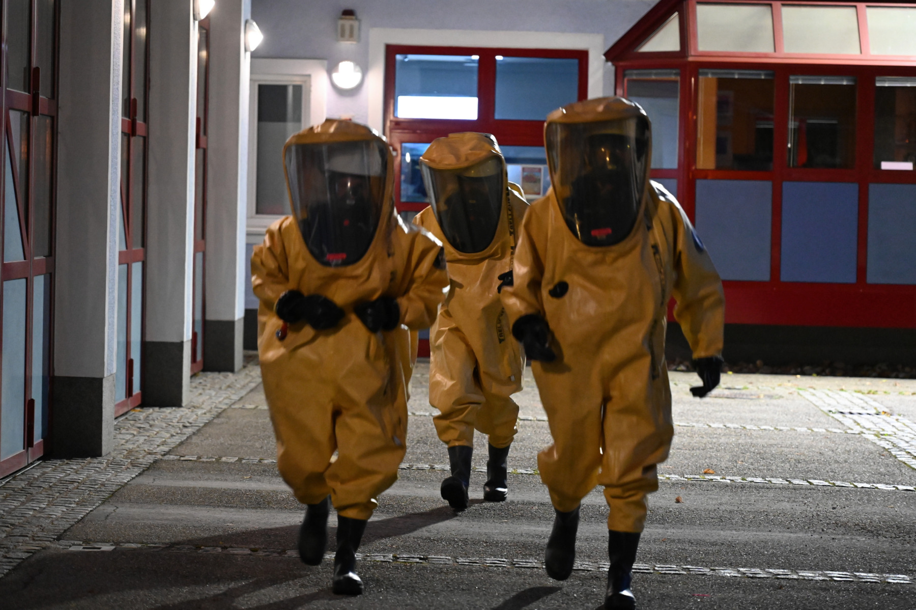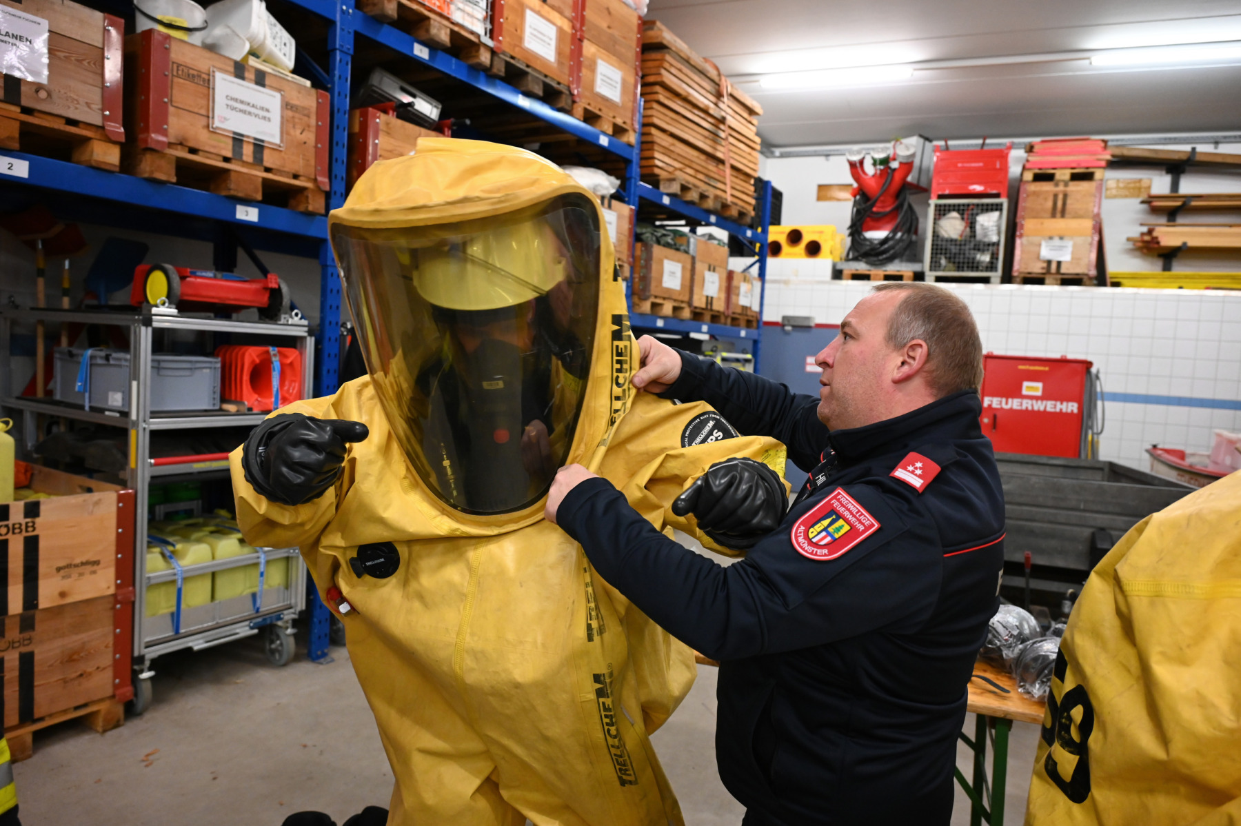 Die Feuerwehr Puchheim als „Gefährliche Stoffe Stützpunkt“ führte mit uns eine praxisnahe Übung durch, bei der auch Teamarbeit im Mittelpunkt stand. Besonders beim Anlegen der Schutzanzüge wurde deutlich, dass jeder Handgriff sitzen muss. Die Atemschutzüberwachung spielte dabei eine zentrale Rolle, um Sicherheit und Koordination zu gewährleisten.