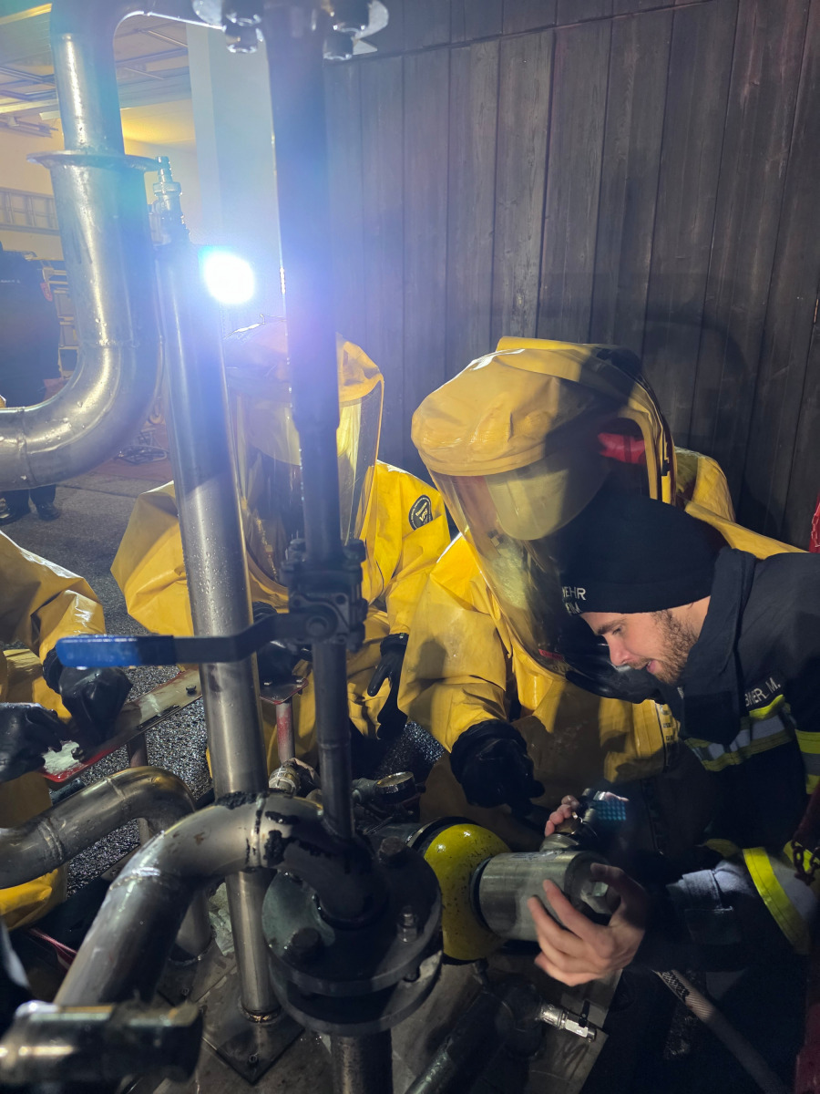 Nach dem Aufwärmen stellten sich die Teilnehmer realistischen Szenarien: Gefahrenstoffe mussten erkannt und entfernt, Leckagen an Leitungen und Gasflaschen behoben und ein Kanal abgedichtet werden.