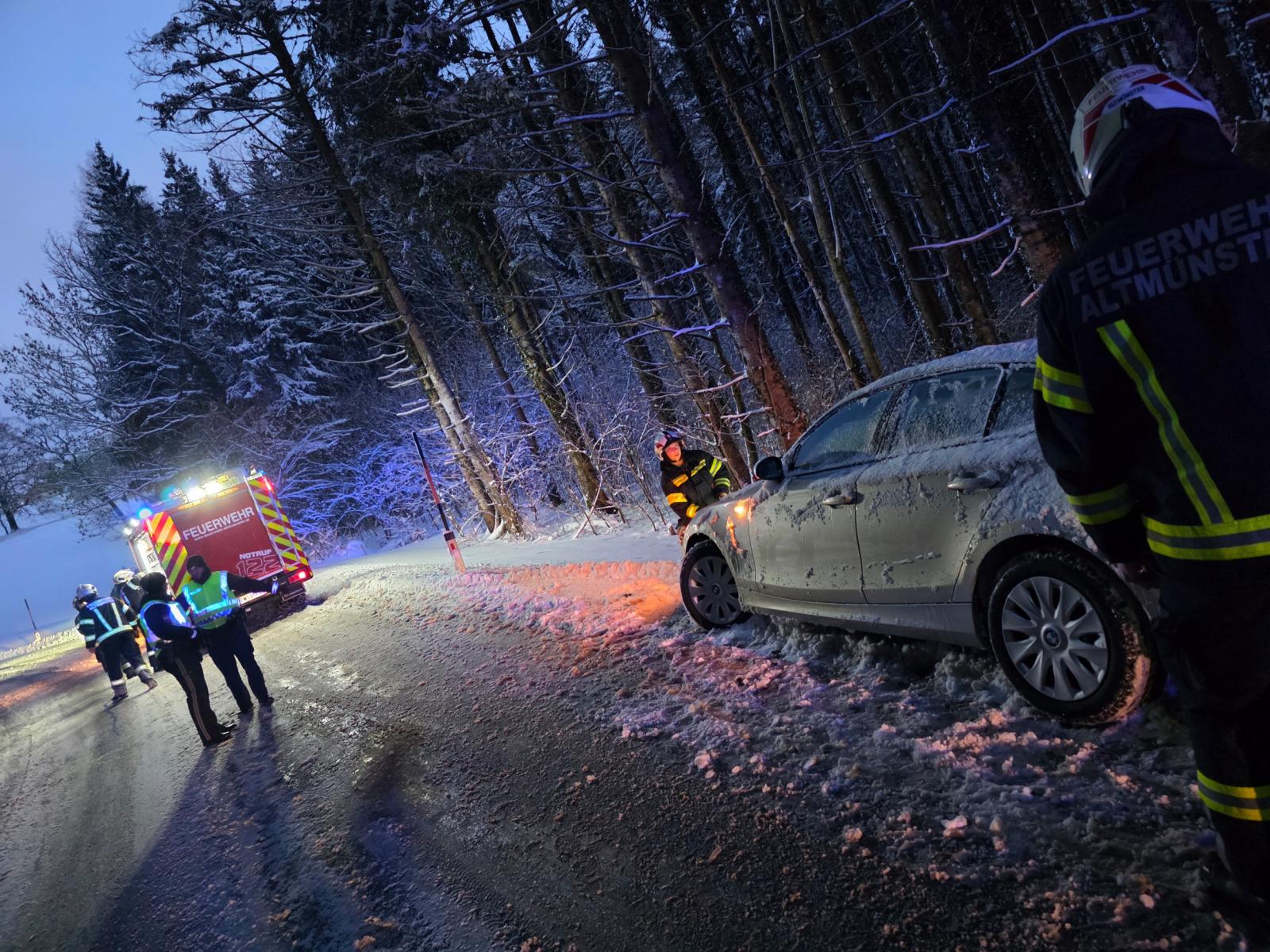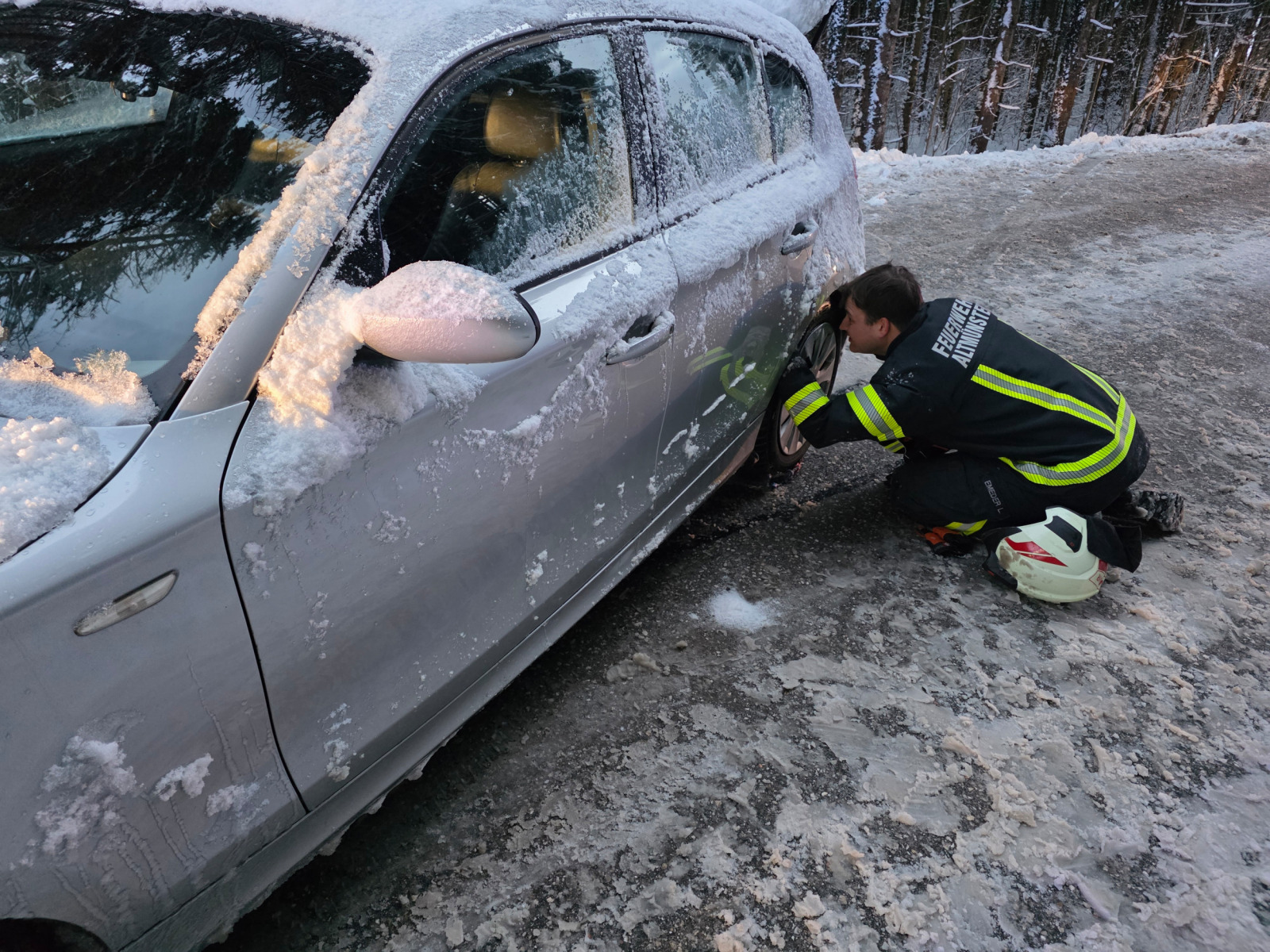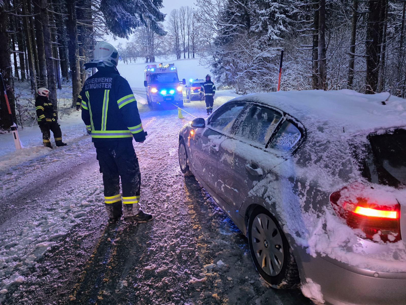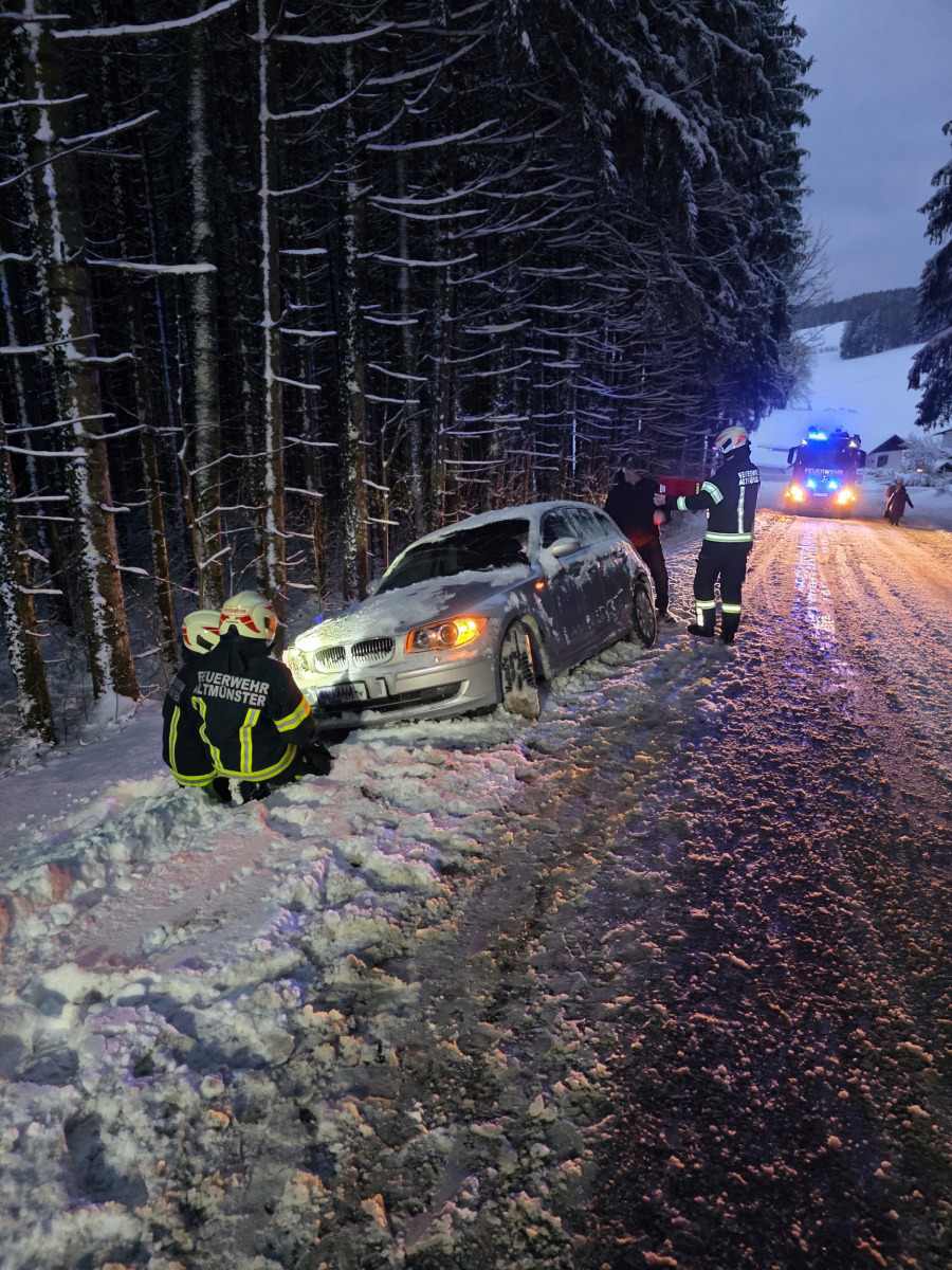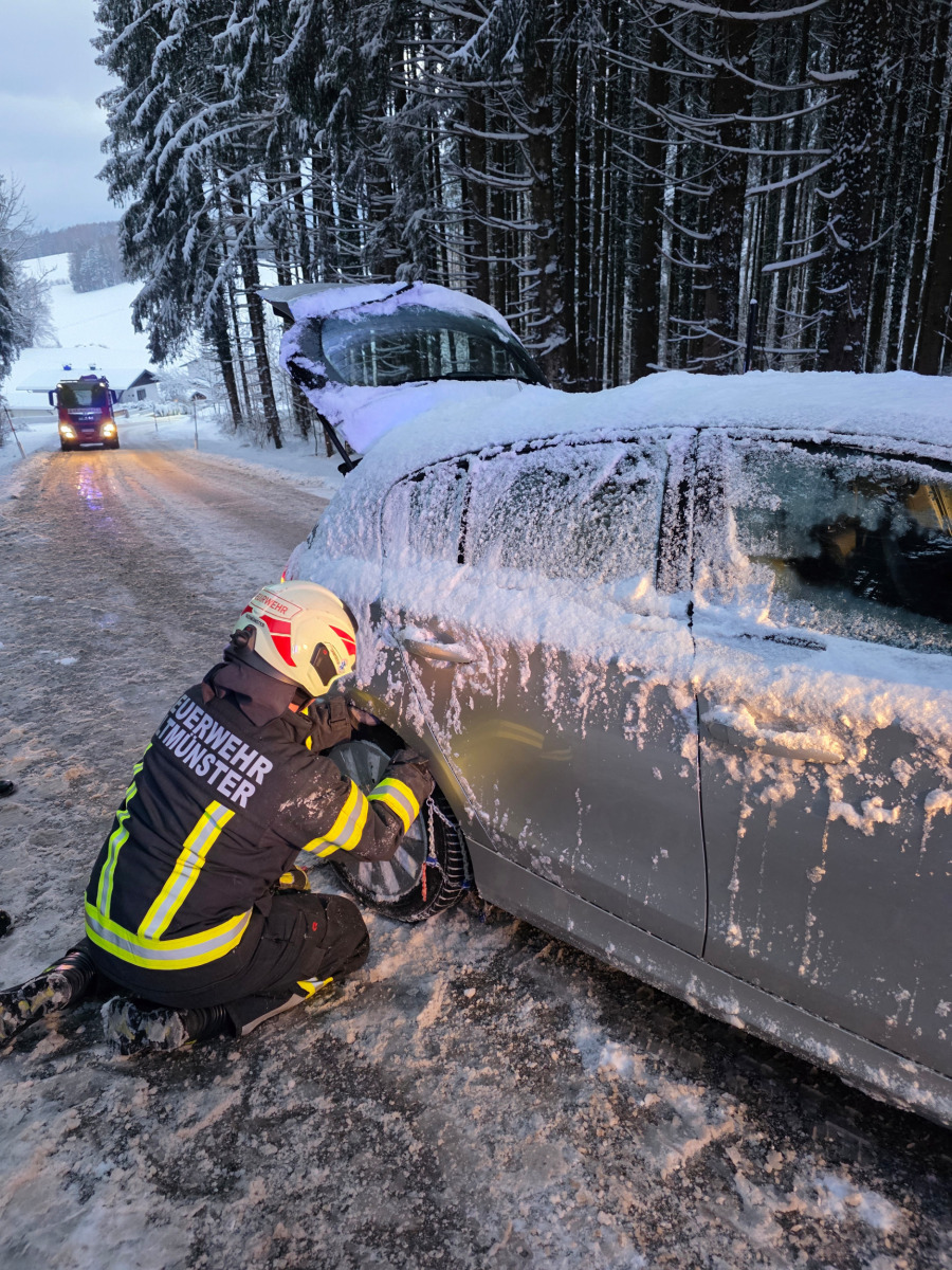 Kurz nach 7 Uhr am heutigen Sonntag wurden wir per Pager zu einer Fahrzeugbergung am Gmundnerberg alarmiert. Ein PKW geriet während der Bergfahrt im Bereich „Auf der Edt“ ins Rutschen und blieb hängen. Der Fahrer versuchte daraufhin, rückwärts auf eine ebene Fläche zu fahren, um Schneeketten zu montieren. Dabei rutschte er jedoch von der Straße und landete im Graben. Mithilfe der Winde unseres KRF konnten wir das Fahrzeug wieder auf die Fahrbahn ziehen. Anschließend montierten wir dem Fahrer die Schneeketten, sodass er seine Fahrt auf den Gmundnerberg sicher fortsetzen konnte.