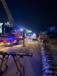 Eine gestürzte Person musste schonend vom 1. Obergeschoss ins Freie gebracht werden. Da der Stiegenaufgang aus platztechnischen Gründen nicht geeignet war, erfolgte der Patiententransport nach der Erstversorgung durch den Notarzt über den Balkon mittels unserer Teleskopmastbühne. Die verletzte Person konnte so sicher auf Straßenniveau verbracht und anschließend dem Rettungsdienst übergeben werden.