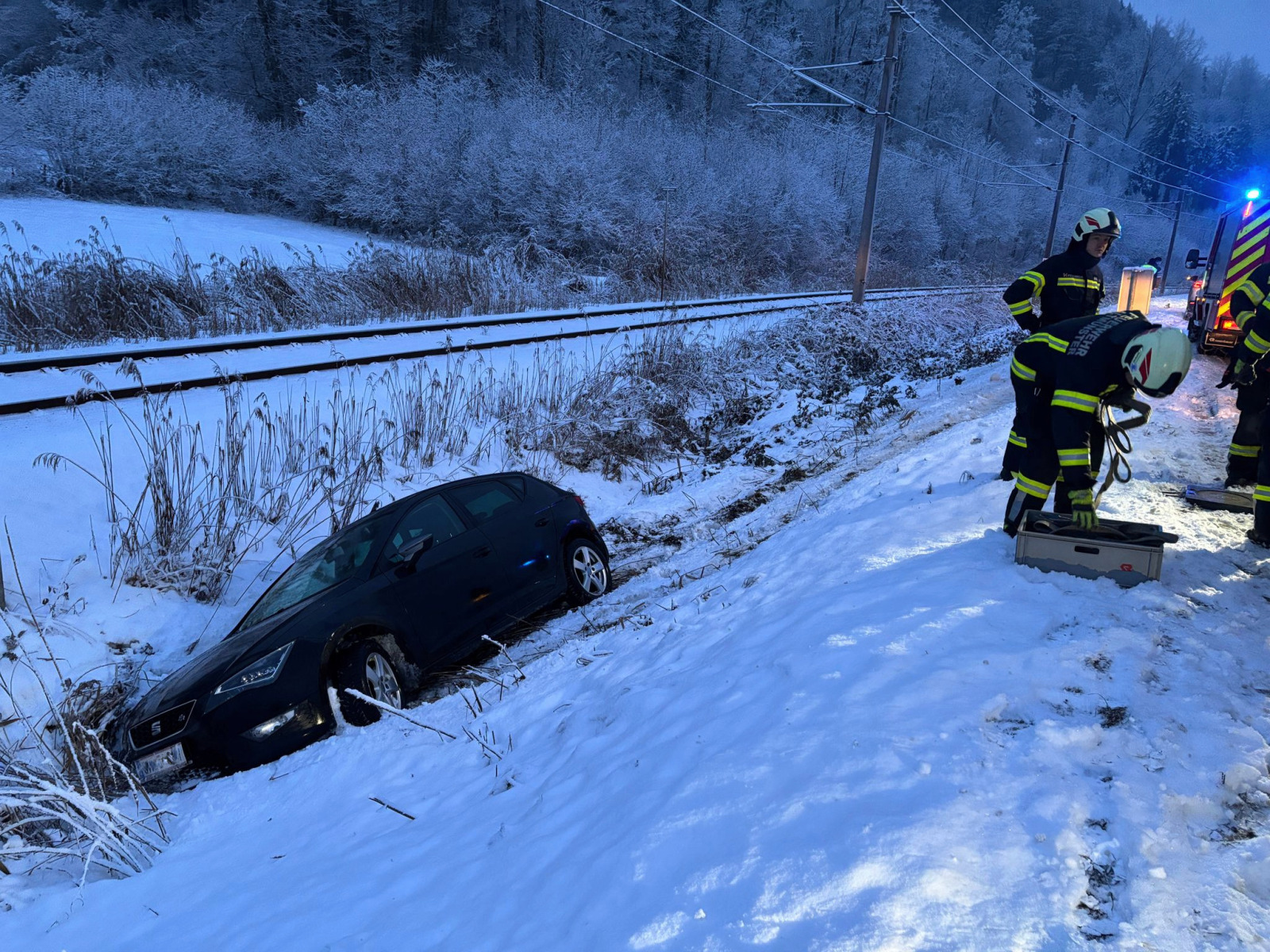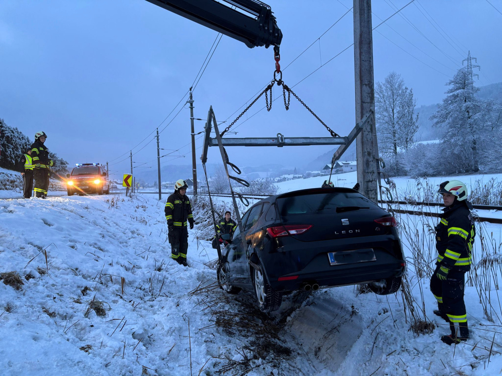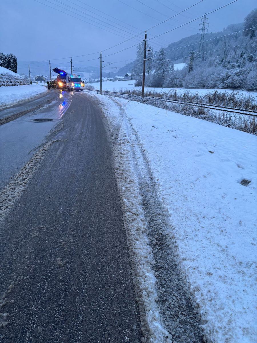 Heute, am 29.01.2026, wurden wir kurz vor 7 Uhr morgens zu einer Fahrzeugbergung in die Hatschekstraße alarmiert. Ein PKW war von der Fahrbahn abgekommen und im Bahngraben gelandet. Mit Hilfe des Krans unseres Wechselladefahrzeugs (WLF) konnte das Fahrzeug geborgen und wieder sicher auf die Straße gestellt werden. Der Fahrer konnte seine Fahrt anschließend fortsetzen. Während der Bergungsarbeiten kam es am Morgen zu kurzen Verkehrsanhaltungen.