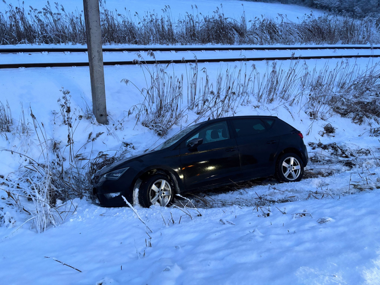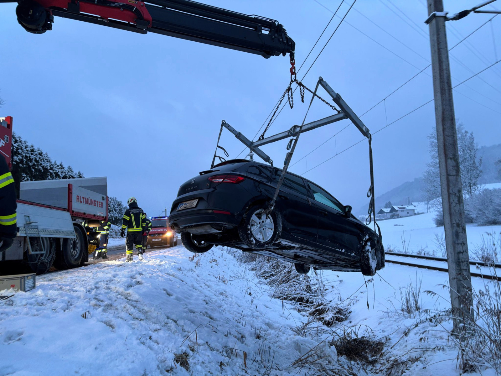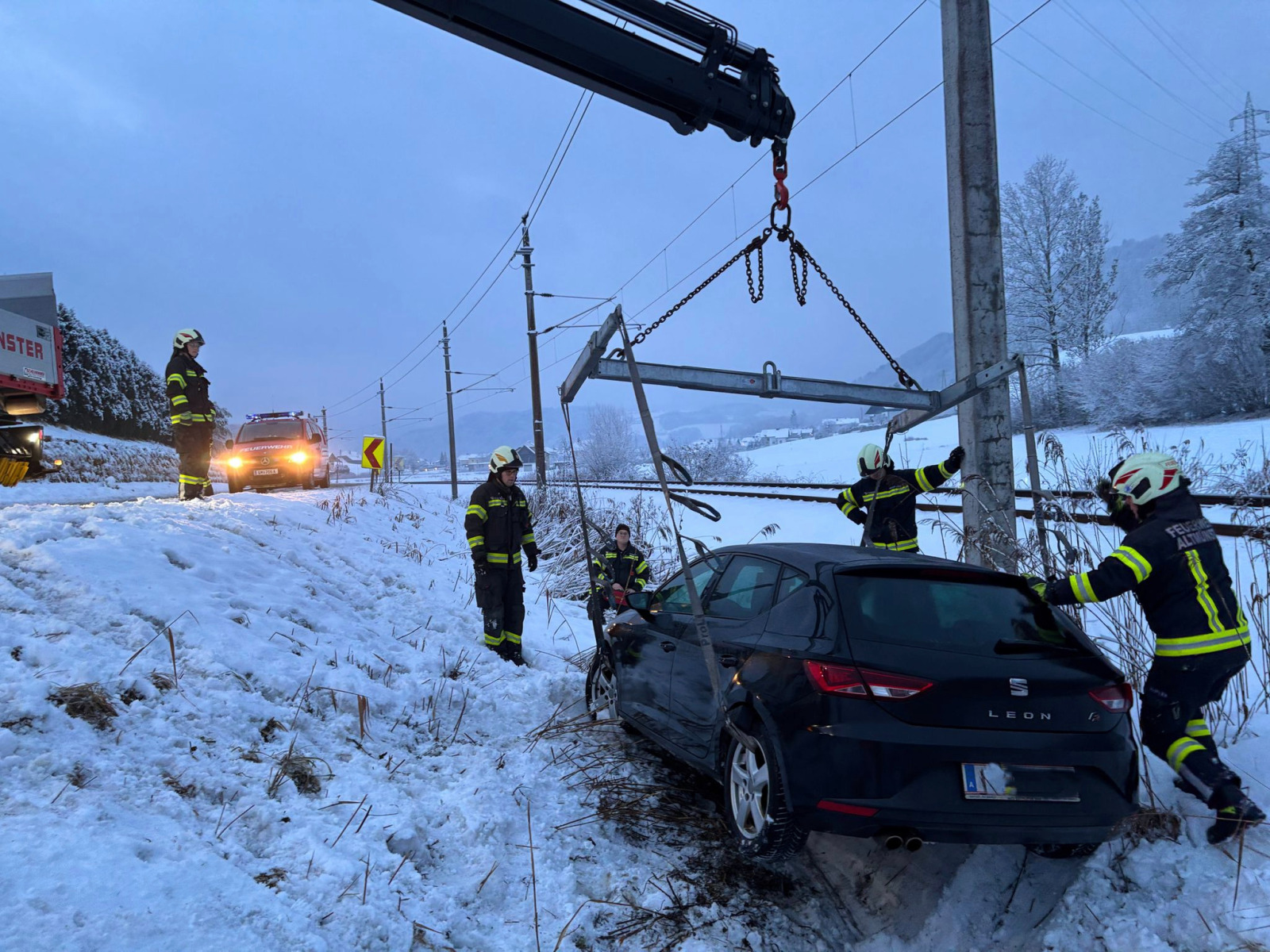 Heute, am 29.01.2026, wurden wir kurz vor 7 Uhr morgens zu einer Fahrzeugbergung in die Hatschekstraße alarmiert. Ein PKW war von der Fahrbahn abgekommen und im Bahngraben gelandet. Mit Hilfe des Krans unseres Wechselladefahrzeugs (WLF) konnte das Fahrzeug geborgen und wieder sicher auf die Straße gestellt werden. Der Fahrer konnte seine Fahrt anschließend fortsetzen. Während der Bergungsarbeiten kam es am Morgen zu kurzen Verkehrsanhaltungen.