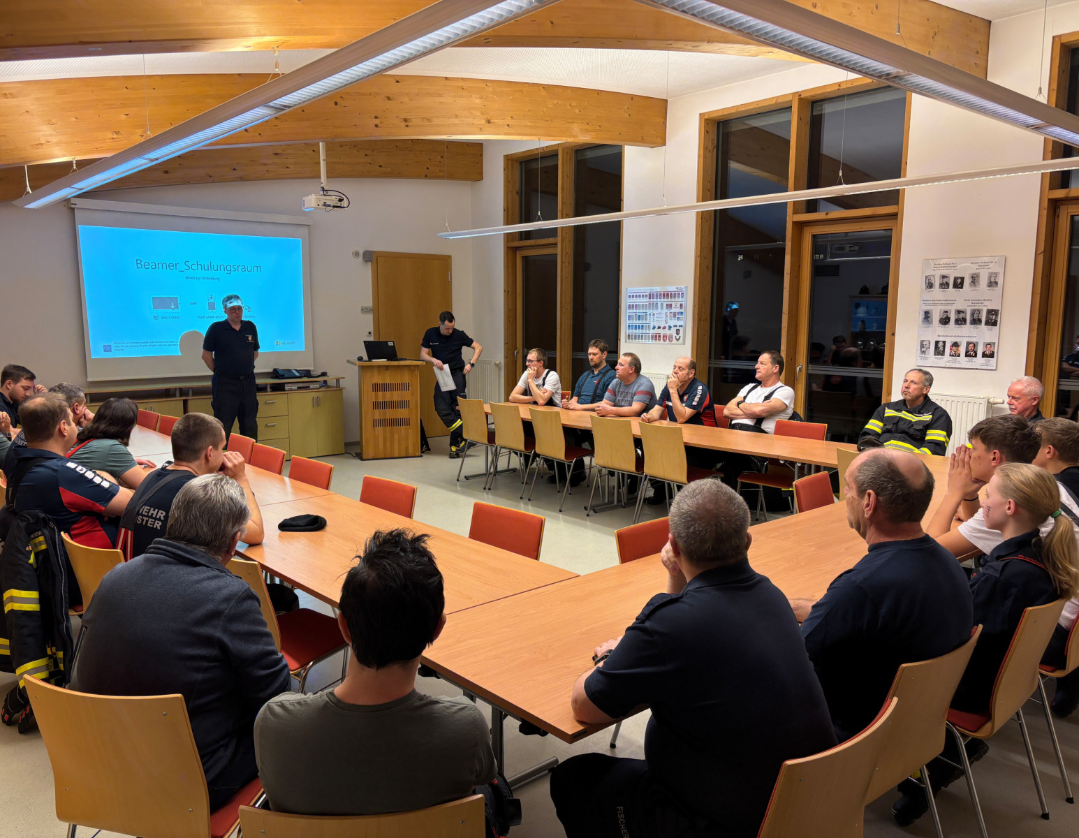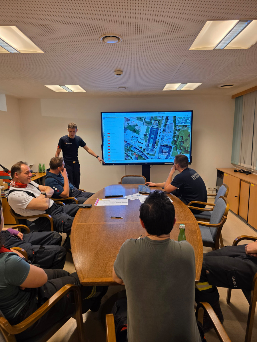 Die Teilnehmerinnen und Teilnehmer wurden in drei Gruppen aufgeteilt, um unterschiedliche Aspekte der Einsatzorganisation zu trainieren. Die erste Gruppe widmete sich im Schulungsraum dem Thema Einsatztaktik. Hier konnten die Mitglieder das erlernte Wissen anhand von Beispielen direkt anwenden und festigen.