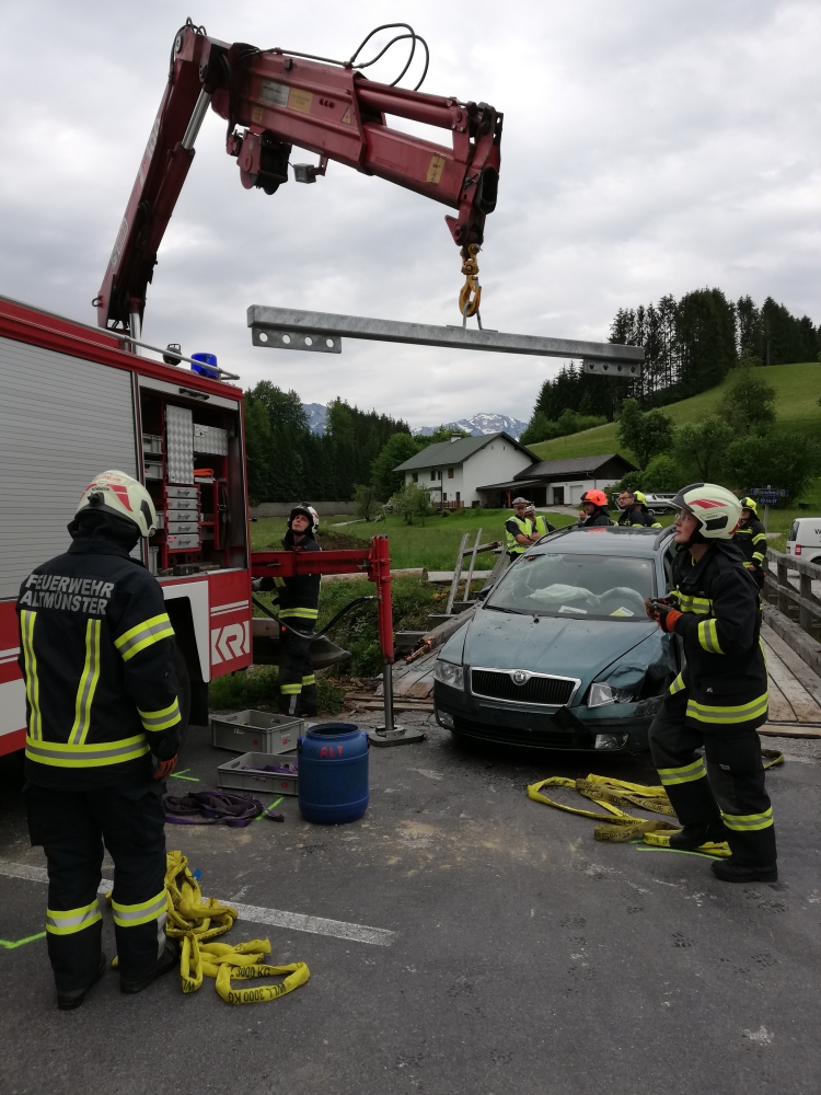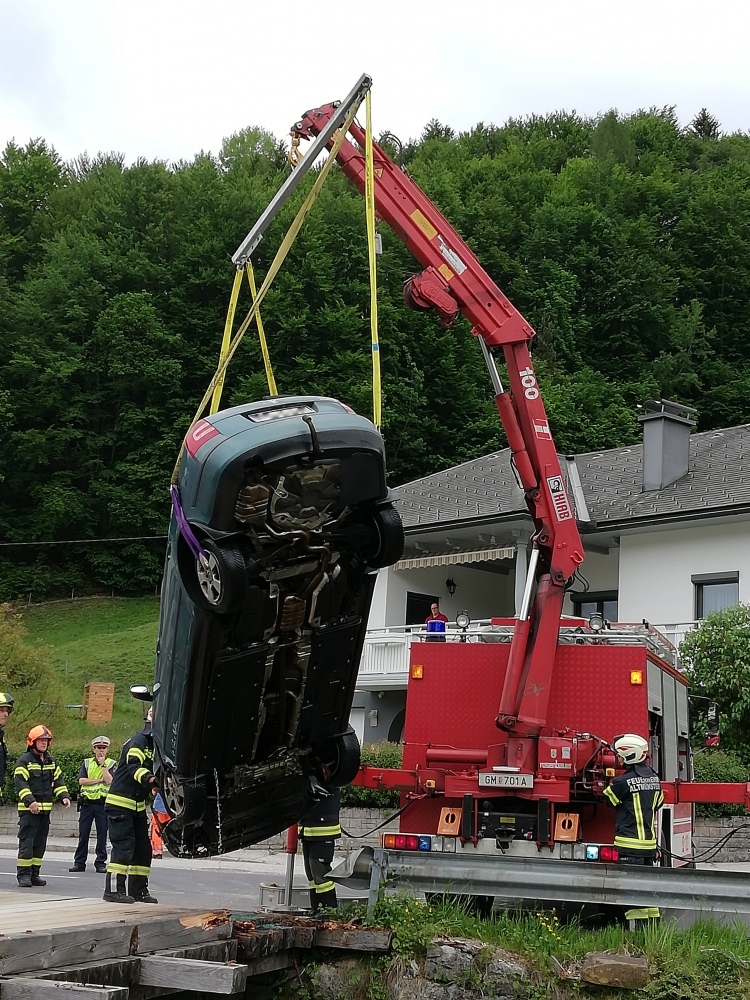 Zu den Bergungsarbeiten wurde die Freiwillige Feuerwehr Reindlmühl alarmiert, wobei sich der Einsatzleiter sofort entschieden hat, das schwere Rüstfahrzeug mit dem Kran der Feuerwehr Altmünster nachzualarmieren.