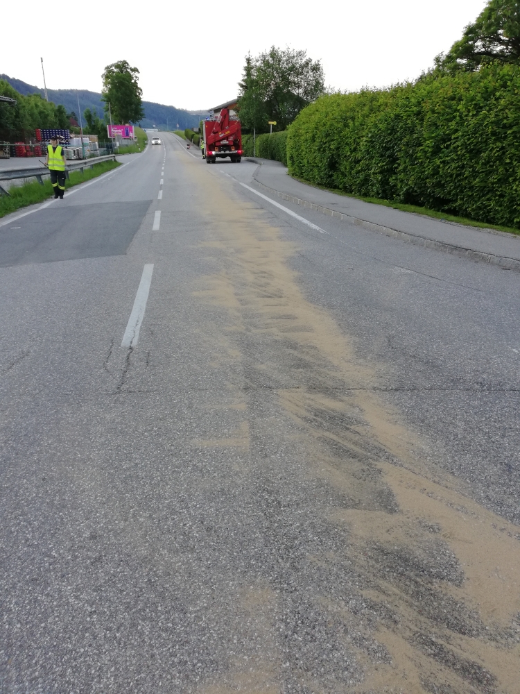 Mittels ausreichend Bindemittel, 15 Einsatzkräften und einer Kehrmaschine der Straßenmeisterei konnte für die wichtige Verkehrsverbindung, nach etwa 2 Stunden, wieder die Freigabe erteilt werden.