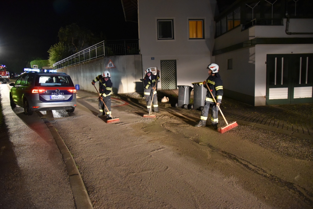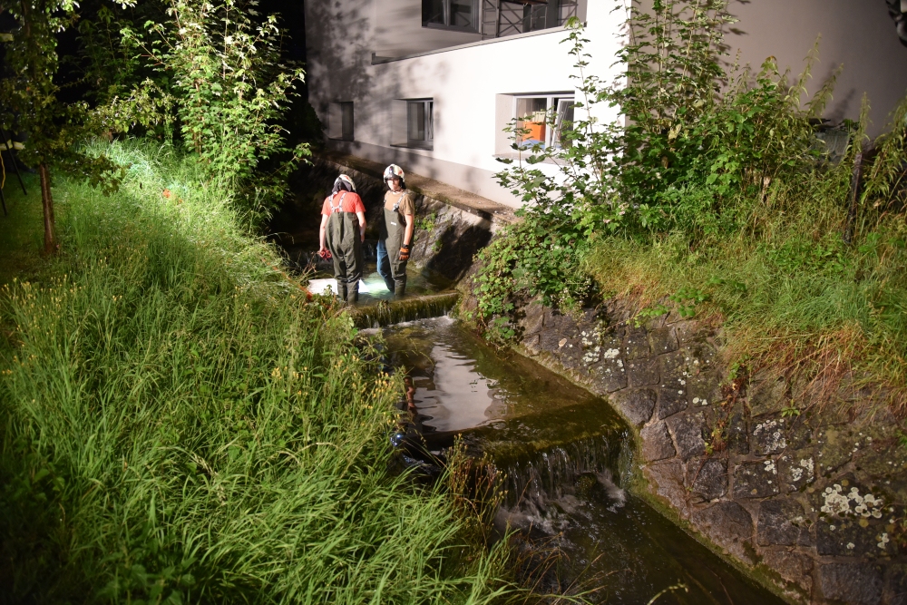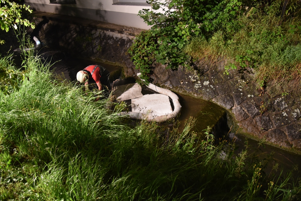 Aufgrund des immer wieder einsetzenden Regens, wurden vorsorglich im nahegelegenen Bach Ölsperren ausgebracht, um weitere Verschmutzungen zu verhindern.