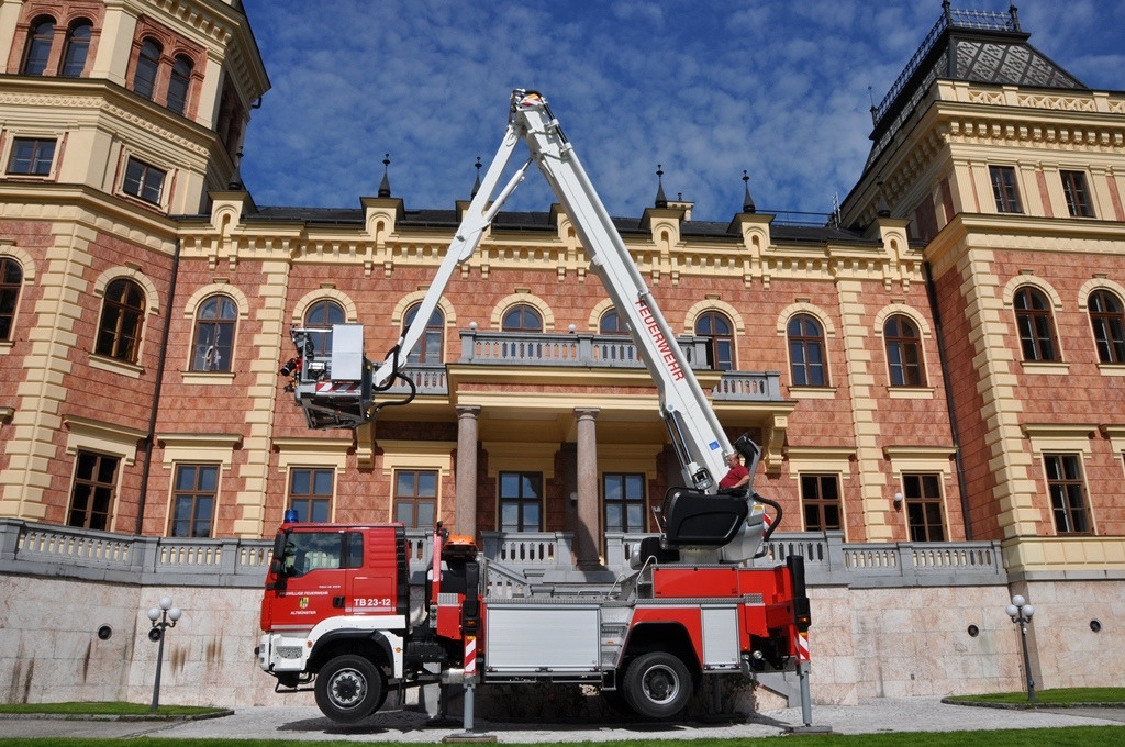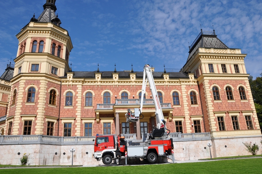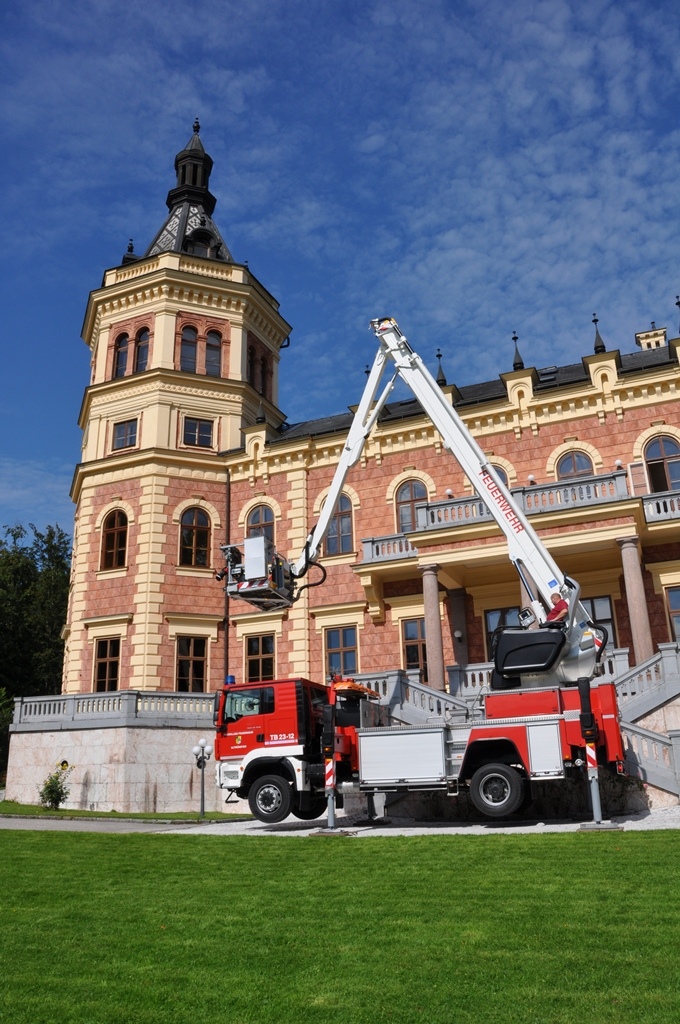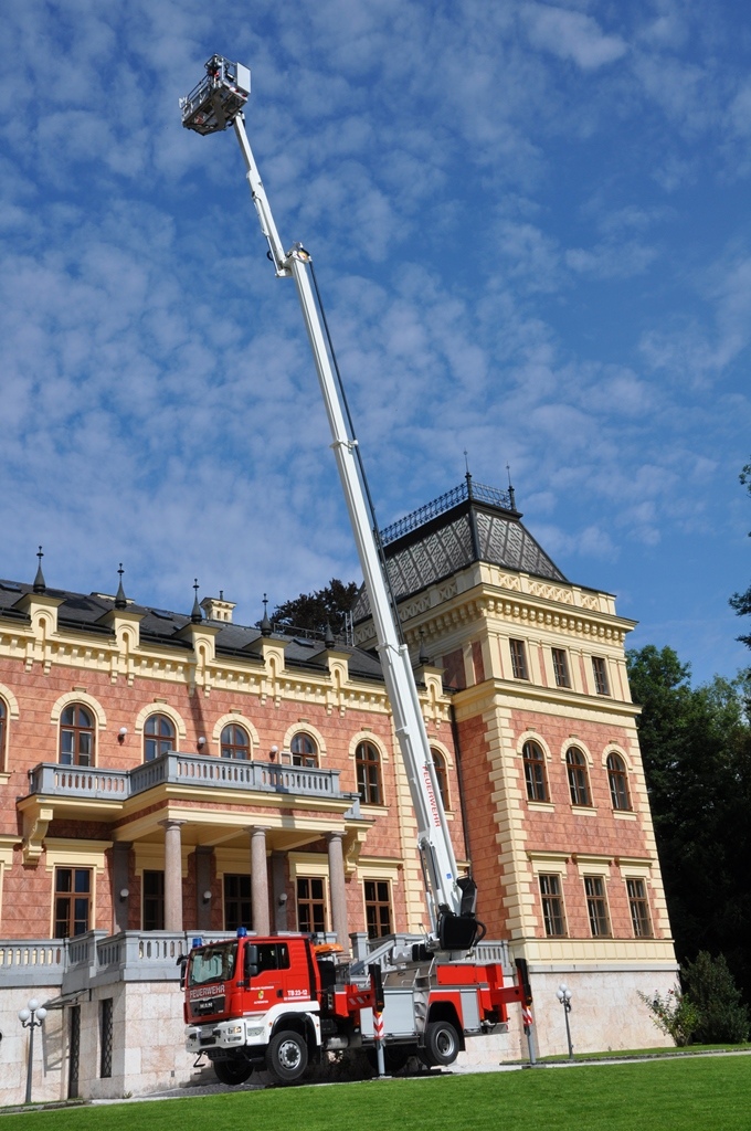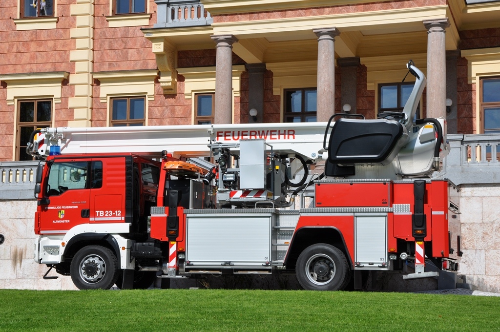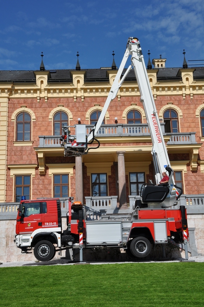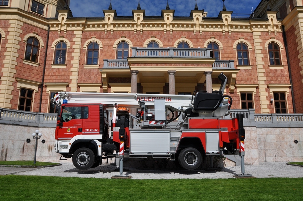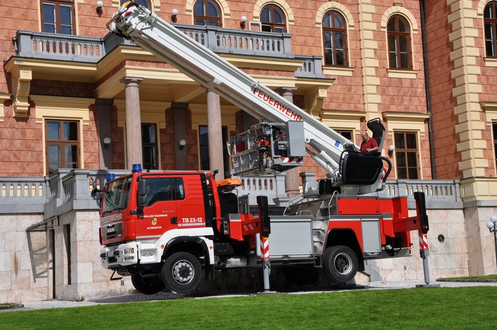 Korblast 500 Kg, Wasserwerfer mit Kamera am Korb, Bodendüsen am Korb für Selbstschutz, Abseilwinde für Personenrettungen im Korb, Rettungstragemontage am und im Korb möglich.