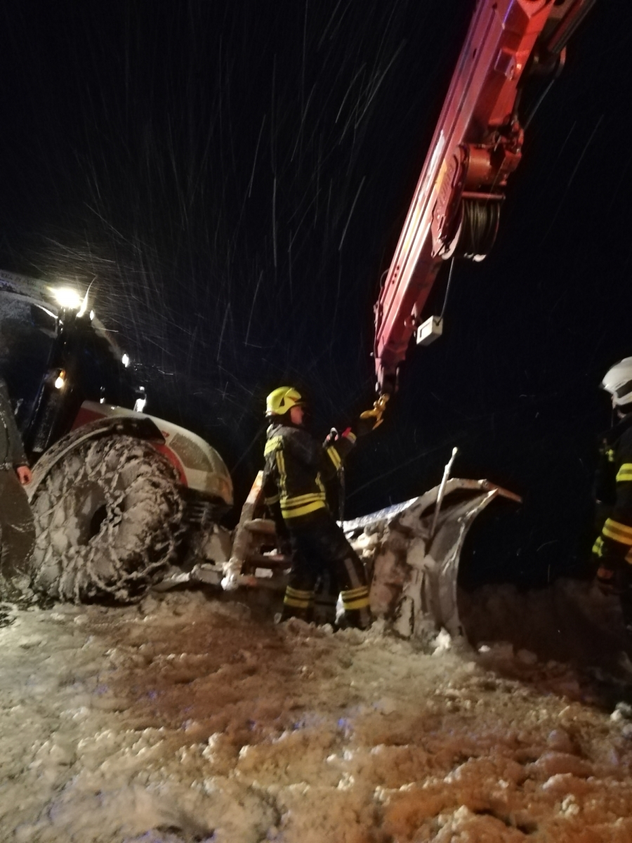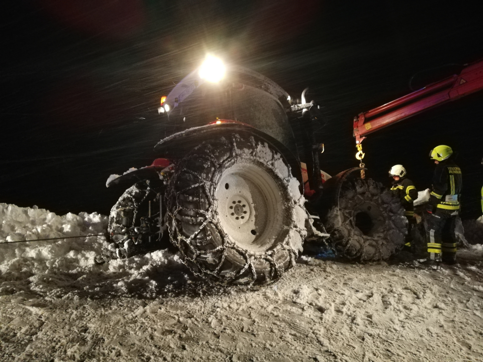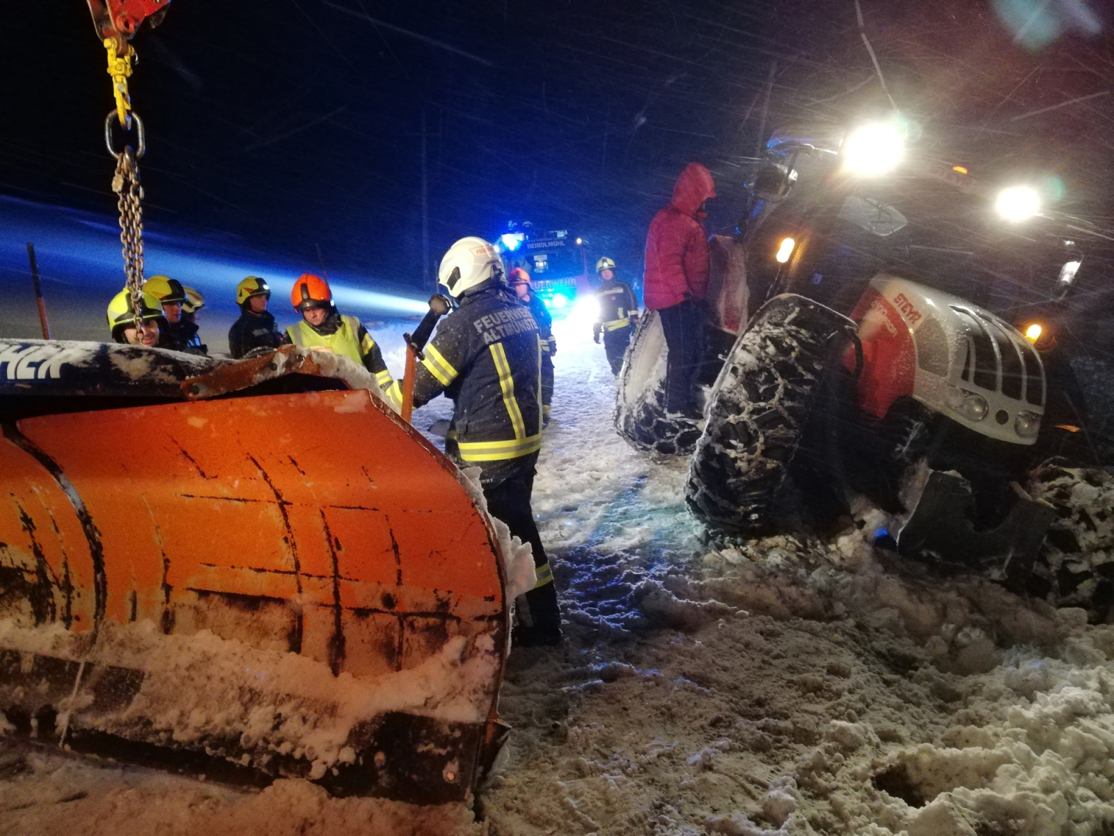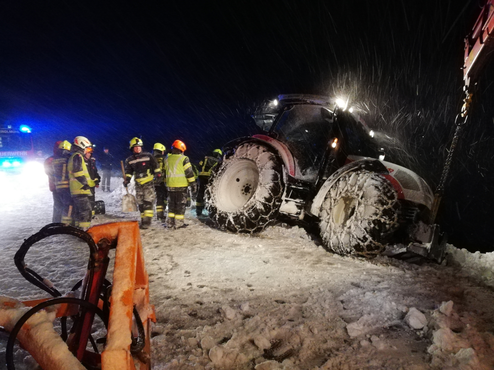 In den Abendstunden des 5.1.2019 fuhr ein Räumtraktor im Auftrag der Gemeinde vom Gmundnerberg talwärts. Aufgrund des starken Schneetreibens kam dieser von der Straße ab und blieb in den großen Schneemengen stecken.