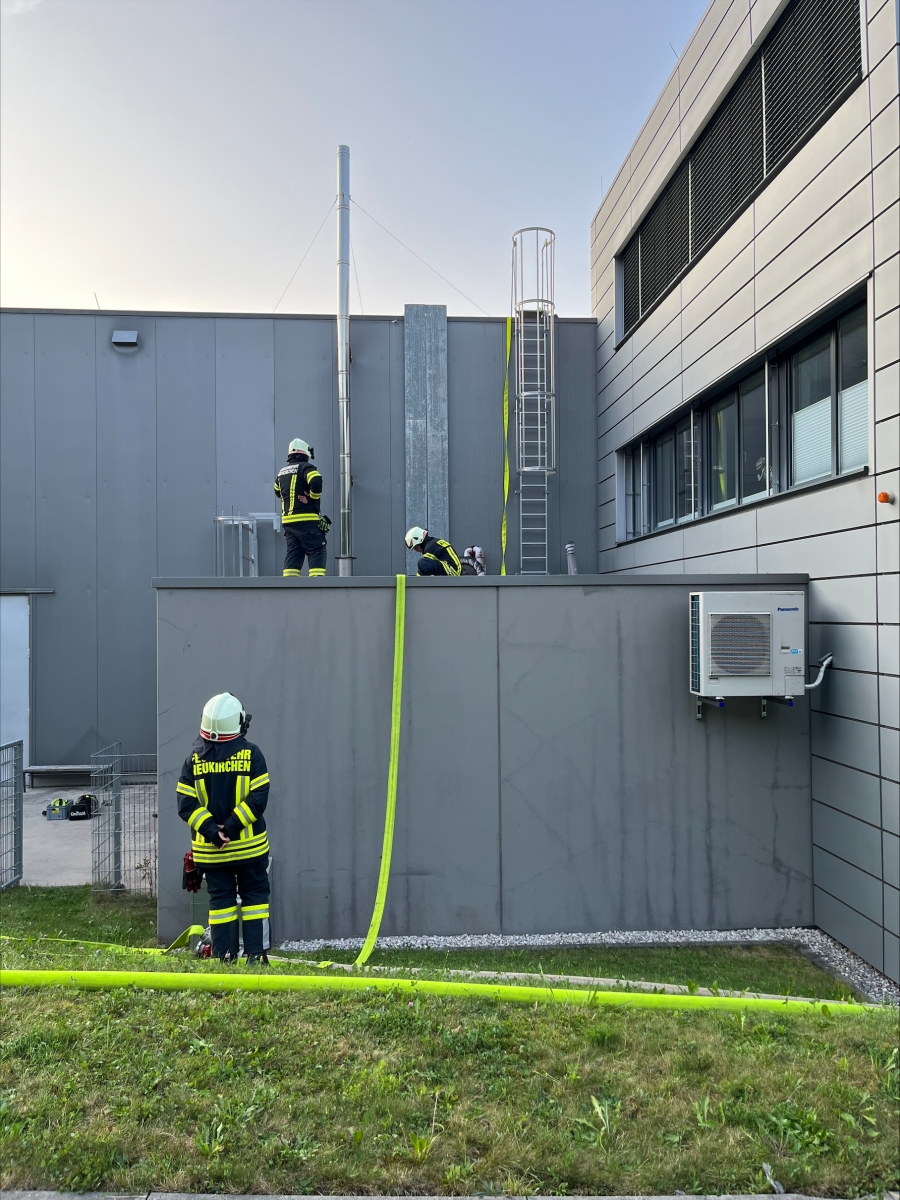 Kurz nach Eintreffen am Einsatzort erhielt der Einsatzleiter die Information, dass sich noch zwei Techniker auf dem Flachdach befinden. Umgehend wurden zwei Atemschutztrupps entsandt, um die Techniker zu suchen und zu retten. Mit Unterstützung der Teleskopmastbühne konnten die beiden Personen schließlich sicher vom Dach gebracht werden.