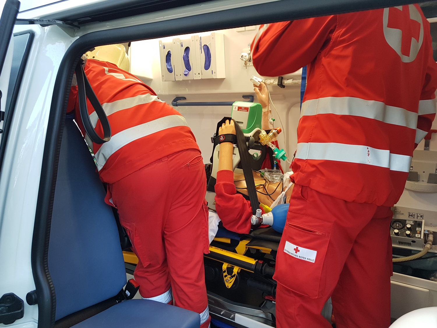 Nachdem alle Patienten gerettet waren und das Übungsziel erreicht war, wurde den Übungsteilnehmern von den Mitarbeitern des Roten Kreuzes noch gezeigt, auf welche Dinge es bei der Verbringung eines Patienten in ein Rettungsfahrzeug ankommt.