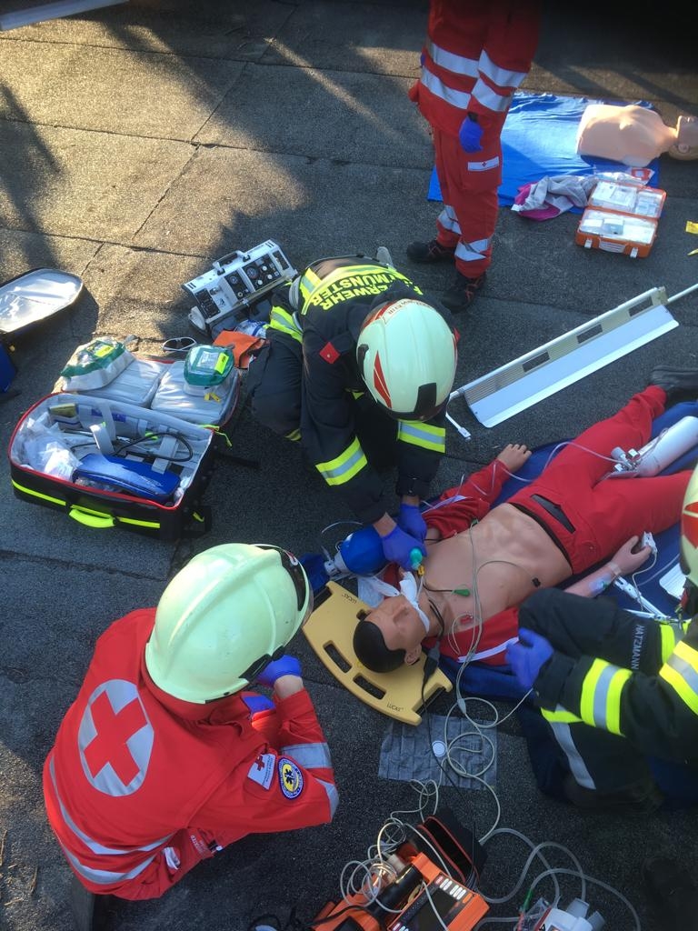 So wurde nach der Lageerkundung durch den Übungsleiter, die Einsatzmannschaft in zwei Gruppen geteilt, um gleichzeitig mit der Versorgung der beiden Opfer beginnen zu können. Rasch wurde eine Schiebeleiter in Stellung gebracht, um zu dem Patienten auf dem Dach zu gelangen. Dort wurde ein lebloser Notfallpatient vorgefunden. Unverzüglich wurde mit den notwendigen Erste-Hilfe-Maßnahmen (Reanimation) begonnen.