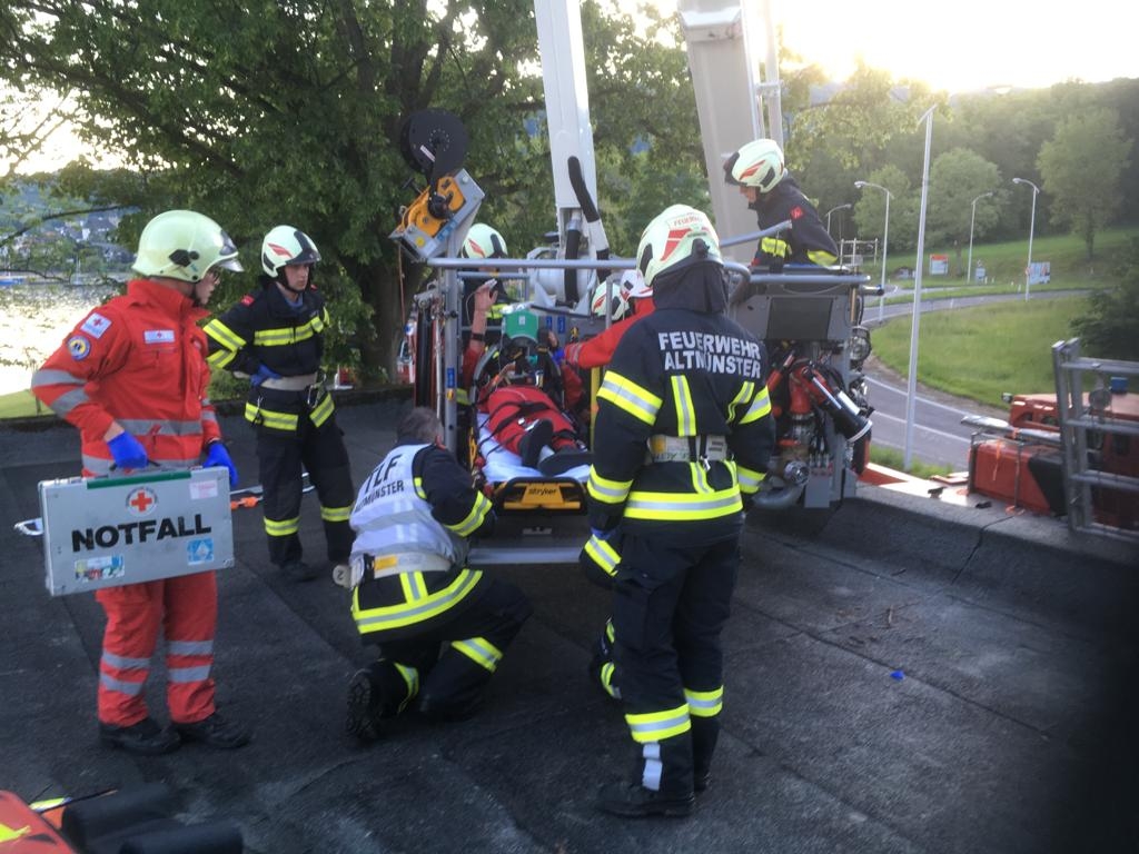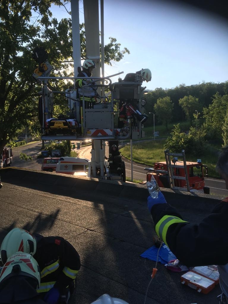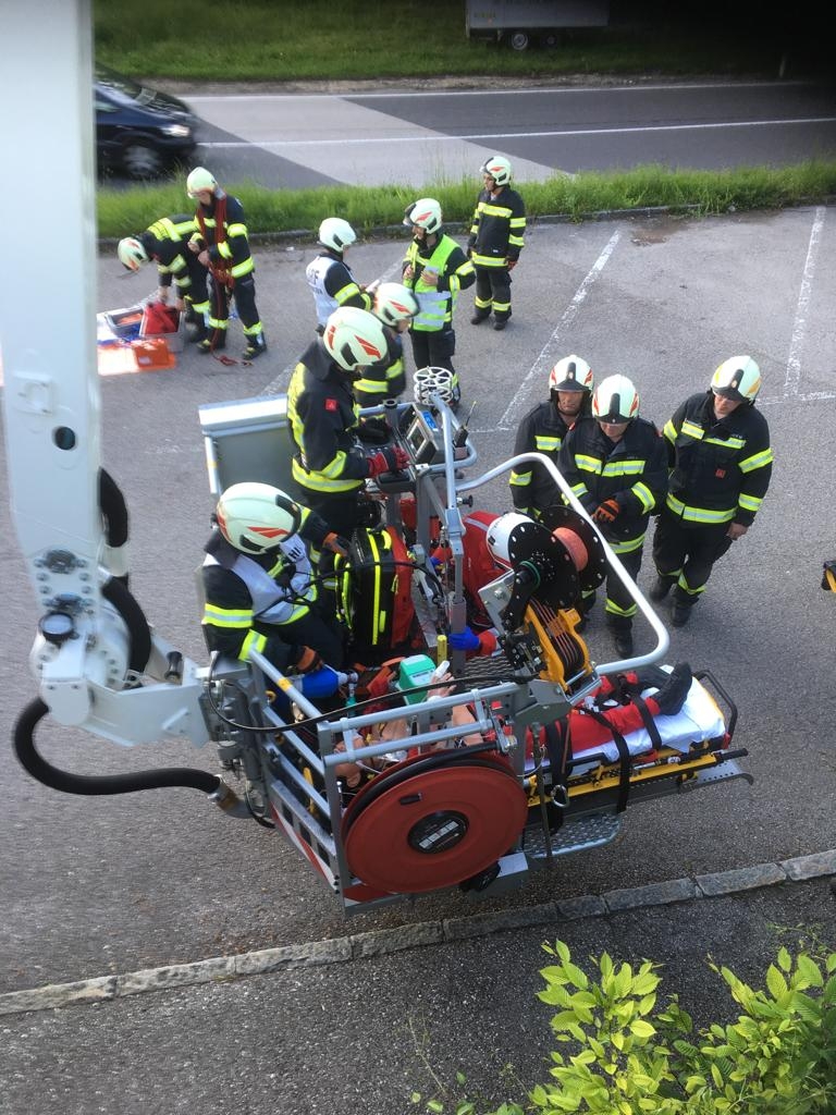 Als auch der zweite Patient zum Abtransport fertig war, wurde dieser mittels der Rettungstrage aus dem Rettungswagen und der TMB vom Dach auf den Boden gehoben.