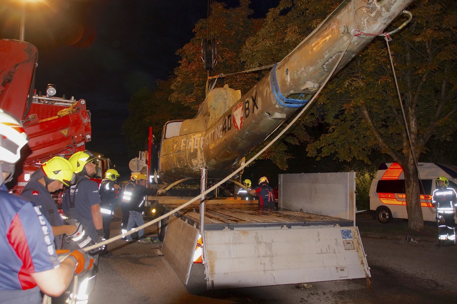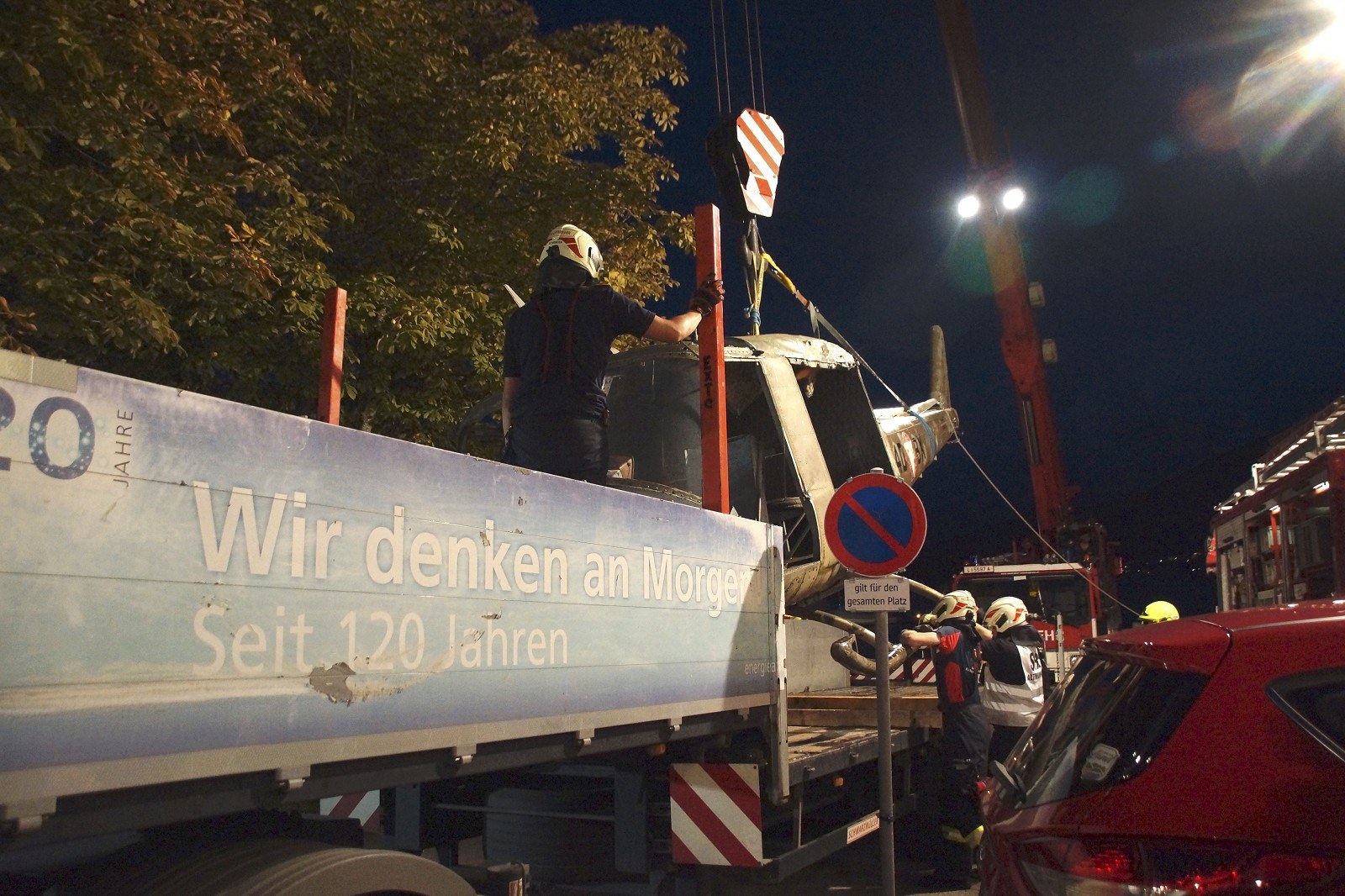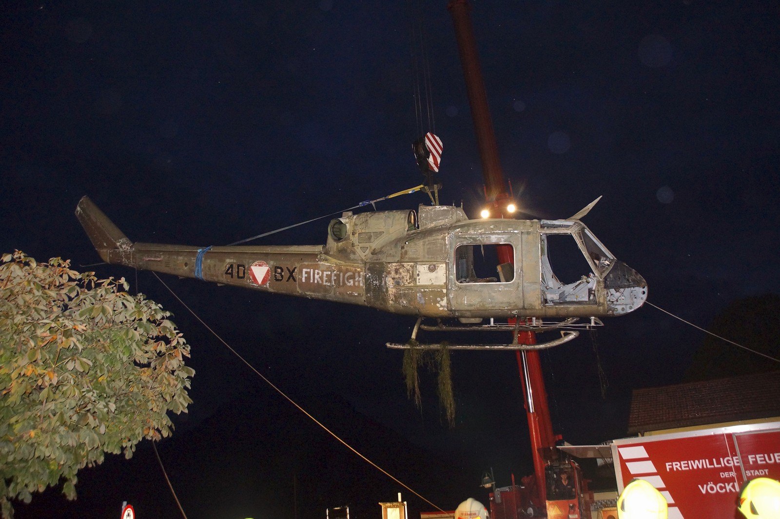 Dort stand das schwere Kranfahrzeug der FF Vöcklabruck bereit, um die Flugzelle aus dem Wasser zu heben und auf einen bereitgestellten Tieflader zu verladen.